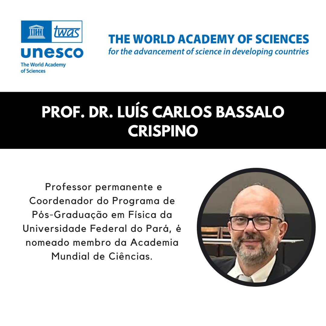O Professor Luís Carlos Bassalo Crispino foi nomeado membro da Academia Mundial de Ciências (The World Academy of Sciences - TWAS), sediada em Trieste, na Itália. O Professor Crispino é Professor Permanente e Coordenador do Programa de Pós-Graduação em Física da Universidade Federal do Pará, e foi reconhecido por suas contribuições pioneiras à Pesquisa em Física e à Divulgação Científica na Região Amazônica. Parabéns, Professor Crispino!