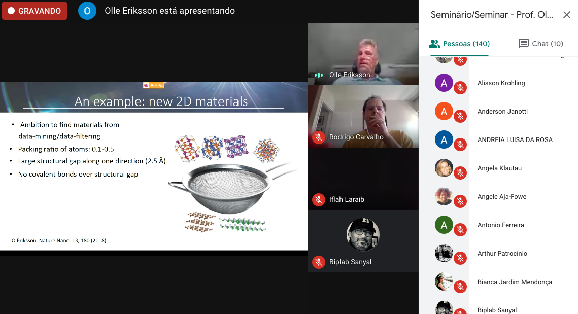Registros do oitavo webinário promovido pelo PPGF. O seminário ministrado pelo Prof. Olof Ragnar Eriksson (Uppsala Universitet & Örebro Universitet, Suécia), foi transmitido simultaneamente pela plataforma Google Meets e pelo YouTube, contando com mais de 170 inscritos/participantes de diversos estados brasileiros, incluindo Amapá, Amazonas, Goiás, Maranhão, Minas Gerais, Pará, Paraíba, Paraná, Pernambuco, Rio de Janeiro e São Paulo; assim como de vários países, incluindo França, Portugal e Suécia.
