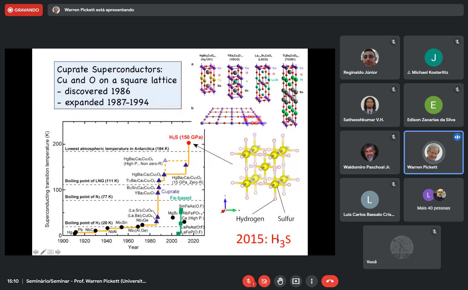 Registros do quinquagésimo terceiro webinário promovido pelo PPGF. A palestra proferida pelo Prof. Warren E. Pickett, da University of California, Davis, EUA, foi transmitida simultaneamente pela plataforma Google Meets e pelo YouTube, contando com mais de oitenta inscritos/participantes. Entre eles, figuraram pessoas dos estados do Amazonas, Espírito Santo, Maranhão, Minas Gerais, Pará, Rio de Janeiro, Rio Grande do Norte e São Paulo; contando também com localidades do exterior, incluindo Coreia do Sul, Estados Unidos da América, México e Portugal. Destacamos a presença de William D. Phillips e J. Michael Kosterlitz, ganhadores do Prêmio Nobel de Física de 1997 e 2016, respectivamente. Além de Belém, a palestra online teve também um público participante das cidades paraenses de Ananindeua, Capitão Poço, Castanhal, Marabá e Santa Isabel.